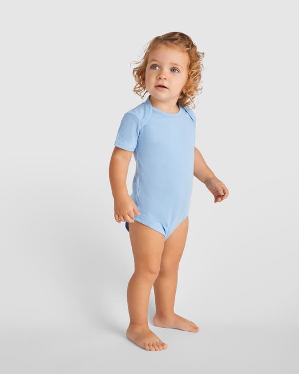 El cierre con botones a presión en la entrepierna facilita el cambio de pañales, mientras que el hombro de apertura cruzada proporciona mayor comodidad al vestir. Con un gramaje de 175 g/m², este body es durable y perfecto para el uso diario.
